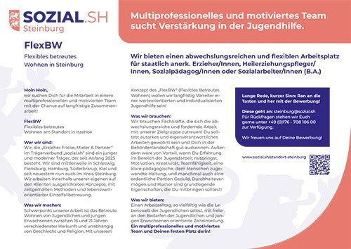 Nutzen Sie gern das Bewerbungsformular auf dieser Seite oder senden uns eine Mail an bewerbung@sozial.sh. Wir freuen uns auch über Initiativbewerbungen. Praktikanten und Studierende der Sozialen Arbeit, die ihr Anerkennungsjahr bei uns absolvieren möchten, sind ebenfalls willkommen.